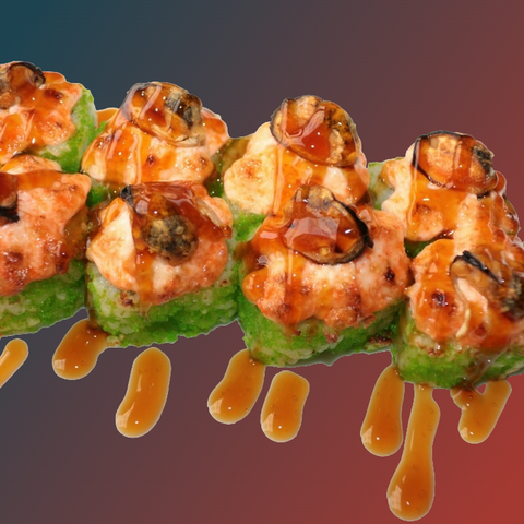 Рис,нори,огурец,масаго,запеченный соус,мидии